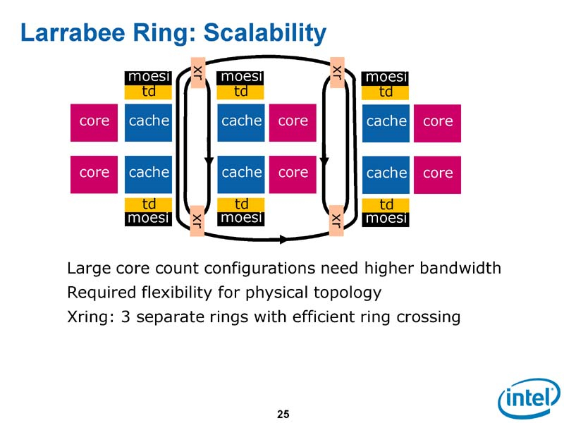 첫 Larrabee는 Xring을 가지지 않지만, 확장 된 제품은 갖게된다. 이에 따라 Larrabee의 급격한 발전이 가능 하다고 한다. 즉, 24 코어 및 32 코어 같은 제품을 기본 아키텍처를 변경하지 않고 신속하게 개발할 수 있다는 것이다.
