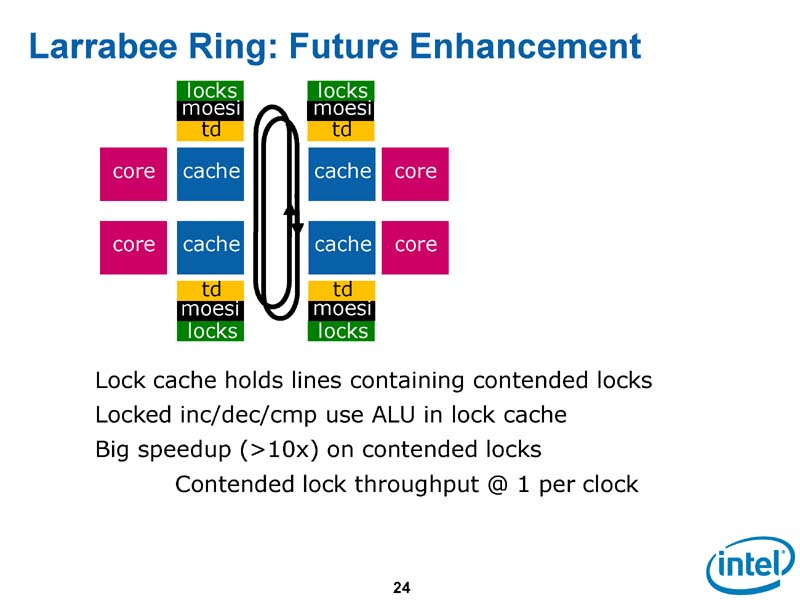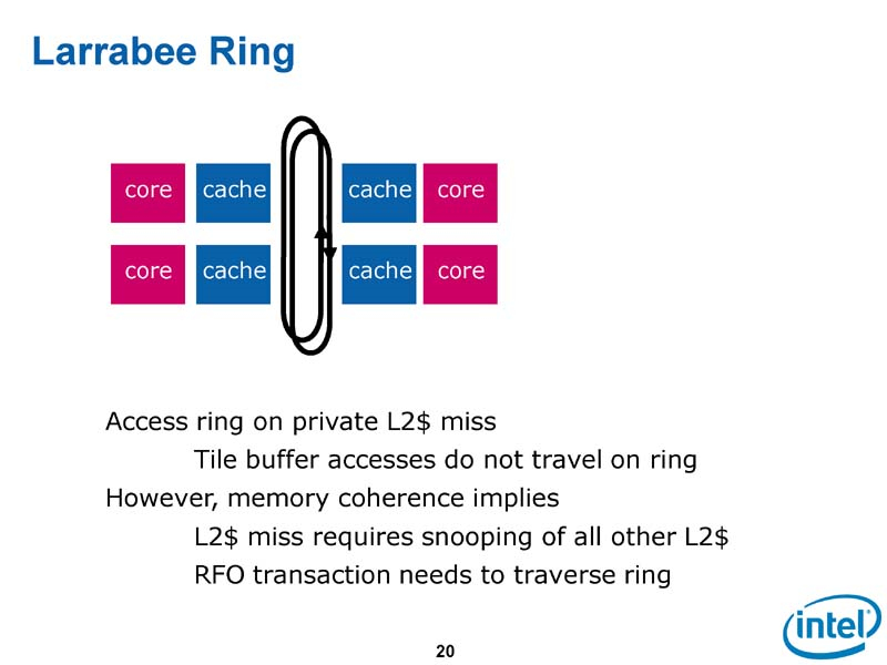 "먼저 시도한 것은 글로벌 태그 디렉토리 (Global Tag Directory) 블록을 추가했다.이 블록은 기본적으로 링 버스의 중앙 집중화 된 포인트에서 링에 모든 캐시 소유자 자격을 관리한다. 사실, 모든 L2 태그의 하드 카피를 유지 "(Carmean 씨).