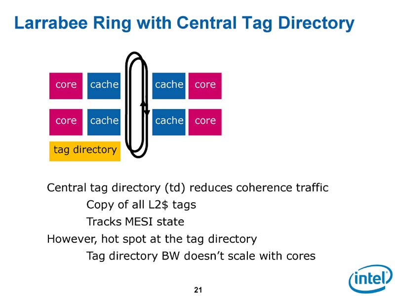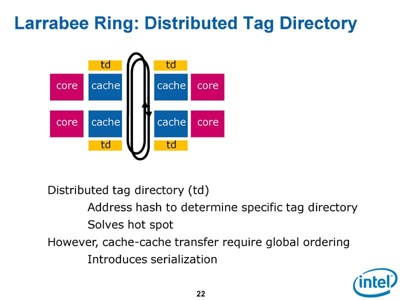 "태그 디렉토리는 링의 핫스팟이 되어 버린다. 핫스팟은 성능의 페널티가 될 것"이라고 Carmean 고 말했다. 또한 코어 수가 증가할수록, 태그 디렉토리에 대한 액세스는 더욱 집중되기 때문에 코어 수의 확장성을 저해해 버린다. 그래서 해결책으로 생각한 것은, 태그 디렉토리 자체를 분산하는 방식이었다.