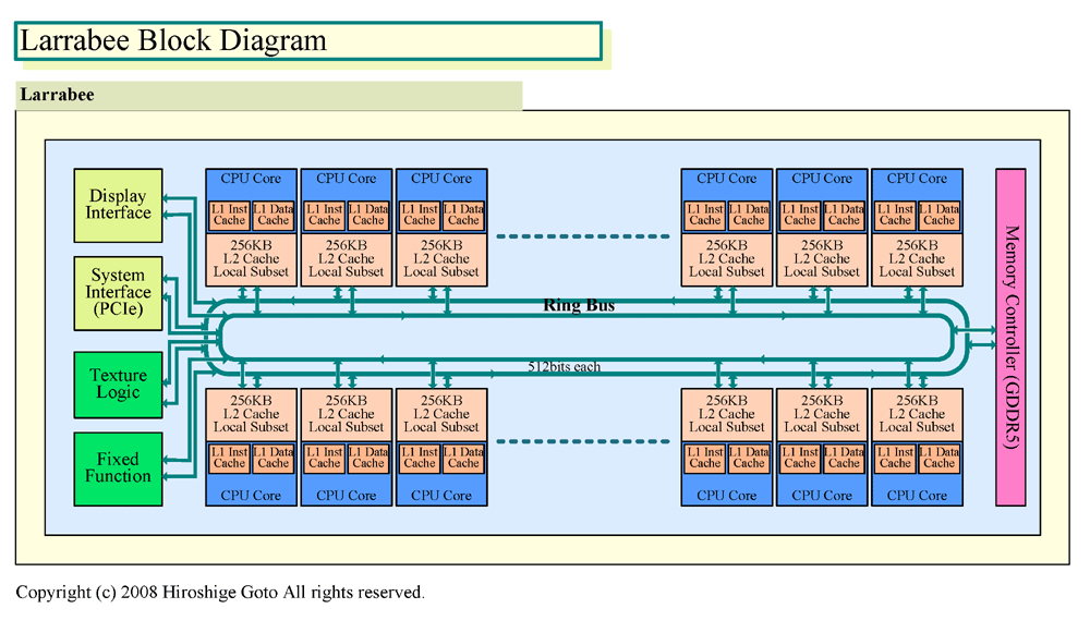 이렇게 보면 Intel은 메인 스트림 CPU 제품으로, 향후 벡터 연산 성능을 높여 스레드 / 작업 병렬성을 높이기 위한 기초적인 기술이 Larrabee에서는 실현되고 있다. 만약 Intel이 2012 년 이후의 CPU를 그쪽 방향으로 더욱 기울이면 이미 길은 보이고 있는 셈이다.