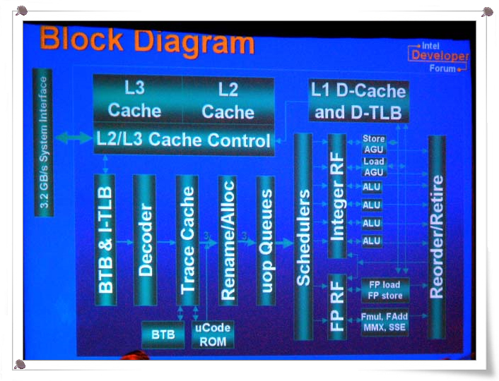 Xeon 프로세서 MP의 블록 다이어그램. L3 캐시가 통합되어 있다. 이 그림을 보면, Xeon 프로세서 MP의 FSB는 현재 Pentium 4와 동일한 400MHz 같지만, 변경 될 가능성도 있을 것이다.