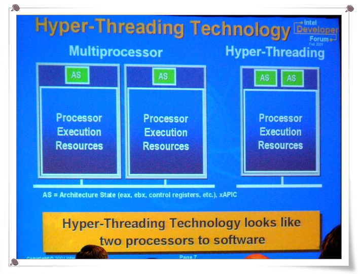 반대로, 단순한 오버 클럭 뿐만이 아니다. 성능 향상 기법으로 소개 된 것이 Hyper-Threading Technology 이라는 기술이다. 평평하게 말하면, NetBurst 아키텍처의 CPU에 AS (Architecture State. eax, ebx 컨트롤 레지스터 같은 레지스터 군과 로컬 APIC)를 추가하여 물리적으로는 하나의 CPU이면서 논리적으로 2 개의 CPU로 가장한 기술이다.