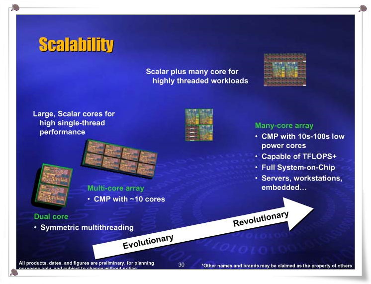 이 의도는 명확하다. Intel은 하드 측이 멀티 / 매니 코어로 급진하며 올리고, 소프트웨어 산업을 견인 하자는 것이다. 반대로 말하면, CPU 측에서 억지로 당기지 않는한 소프트웨어 측면의 변혁을 바랄 수 없다고 생각하고 있다. CPU에서 최대 점유율을 가진 Intel 다운 생각이다. Intel은 하드의 변혁이 소프트웨어를 당기는 형태의 전략을 취하는 것이 많아, AMD와 비교하면 소프트웨어 측의 관성을 경시하는 경향이 있다.