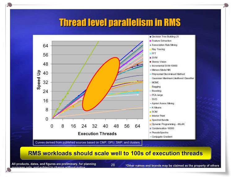 Intel의 Smith 씨는 RMS 분야의 응용 프로그램의 스레드 병렬성에 대해 아래와 같은 그림도 보여줬다. 이것을 보면 전체 10 스레드의 병렬 처리에 의해 선형 적으로 성능 향상을 바랄 수 있는 응용 프로그램이 다수 존재하게 된다.