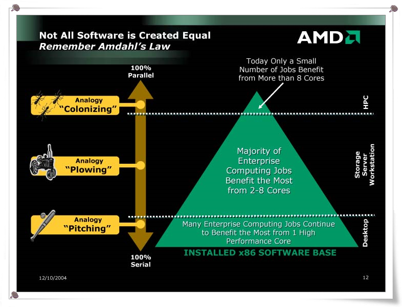 이러한 Intel 측의 견해에 대해 AMD의 그것은 다르다. 아래는 AMD의 Fred Weber (프레드 웨버) 씨 (Corporate VP and CTO)가 2004 년 12 월에 "Lehman Brothers T4 Conference"에서 행한 프레젠테이션의 슬라이드다. 이 슬라이드는 AMD가 Amdahl의 법칙을 인용하여 기존 x86 소프트웨어에서 동시성과 멀티 코어의 문제를 다루고 있다.