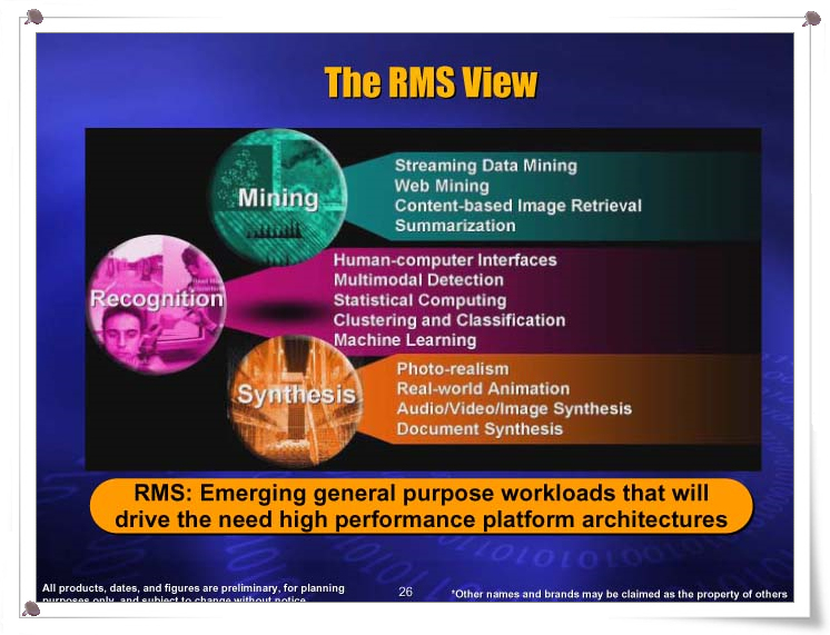 Intel은 명확하게 매니 코어가(MIC.제온 파이) 현재 응용 프로그램을 위한 아키텍처는 아니라고 말하고 있다. 그럼, 어떤 응용 프로그램을 예상하고 있는 것인가?. Intel은 멀티 / 매니 코어 시대에 대상 응용 프로그램 분야를 "RMS"라고 부르고 있다. RMS는 "Recognition" "Mining ''Synthesis '의 이니셜을 딴 것으로 인식 마이닝 (분석 & 추출) · 합성,라는 것이된다. RMS는 Intel의 Stephen L Smith 씨 (Vice President, Desktop Platforms Group)가 아시아 프레스 용으로 12월에 행한 멀티 코어 브리핑 등에 나온 키워드이다. Intel은 이 영역의 응용 프로그램 스레드 병렬성에 이 곳에 연구를 거듭하고 있다고 한다.