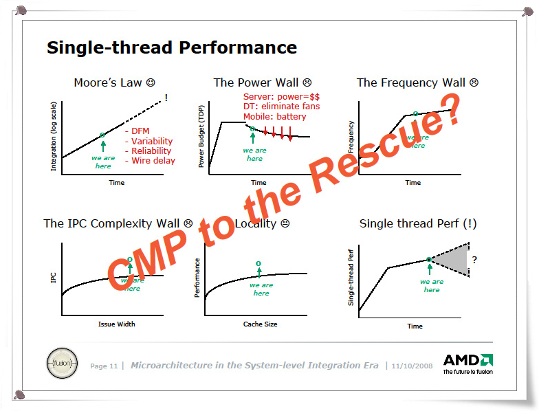 그러나 throughput 컴퓨팅을 위한 하드웨어가 간다해도, 여전히 싱글 스레드 성능은 중요하다. 그것은 Amdahl의 법칙이 살아 있기 때문에, 직렬 구성 요소는 반드시 남기 때문이다. 특히 OS는 코드의 대부분은 기본적으로 직렬 구성 요소이기 때문에 OS의 확장성이 어느 시점에서 병목 현상, 그리고 AMD의 슬라이드에서는 지적되고 있다. (윈도 10에 와서야 어느정도 병렬화)