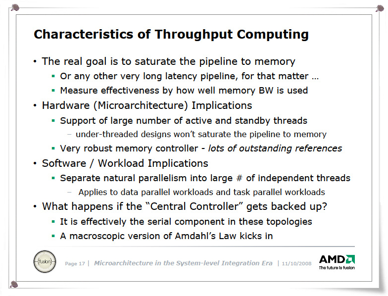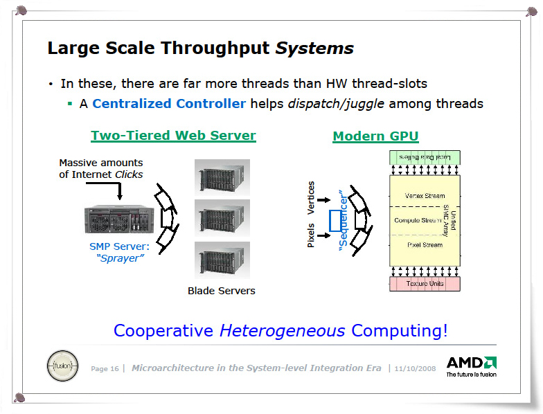 그러면 실제 쓰루풋 컴퓨팅의 구현은 어떤 스타일이 되어가는 것인가? AMD의 Moore 씨의 Micro41 슬라이드는 throughput 컴퓨팅의 고찰에서, 2010년대 회사의 CPU의 모습을 엿볼수 있다.