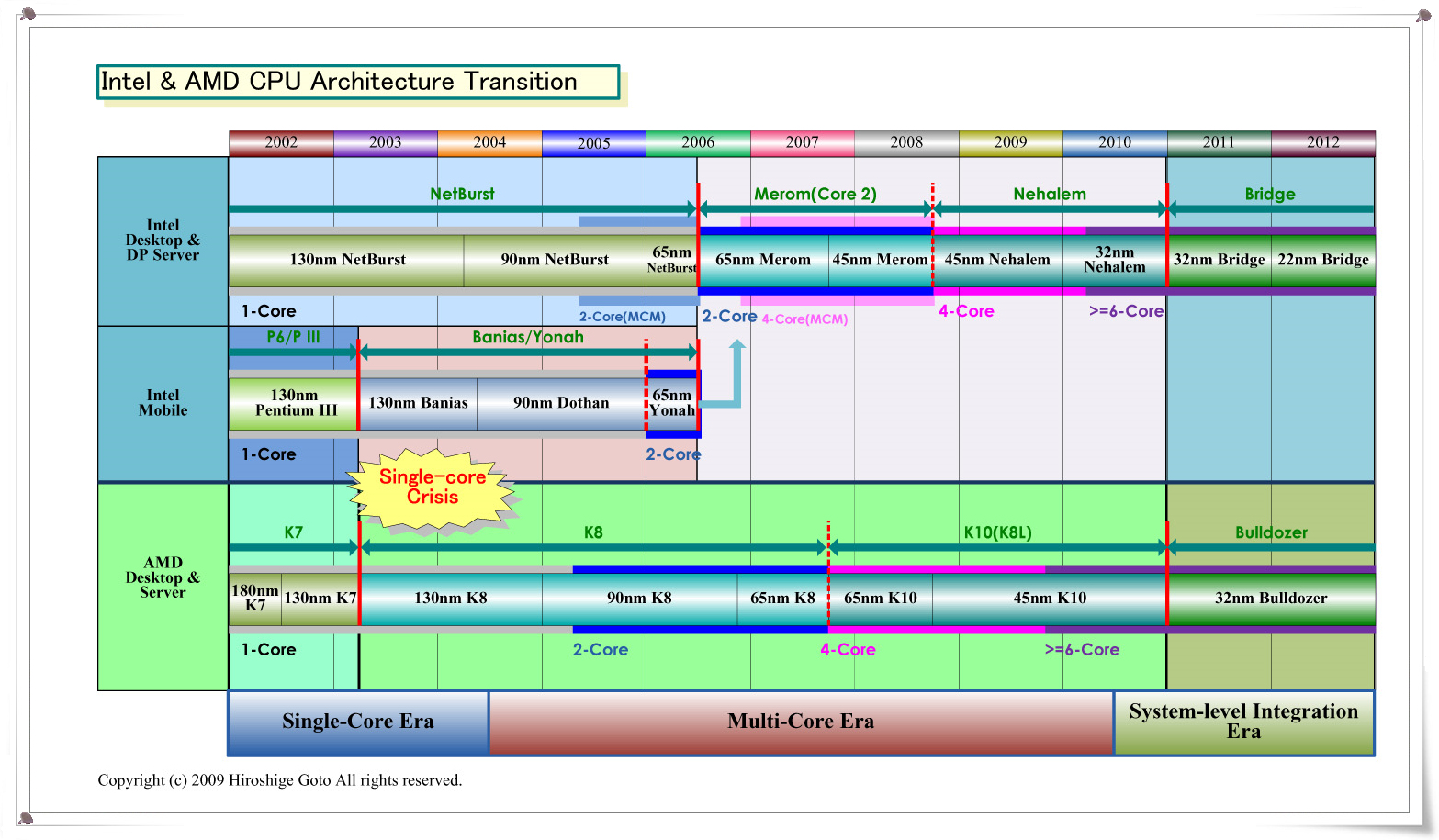 CPU는 100 코어 시대를 향해 돌진하고 있다. Intel과 AMD 등 주요 CPU 업체의 기술 리더를 시작해 많은 CPU 업계 관계자가 이렇게 말했다. 이미 CPU 메이커에 있어서는, 100코어는 규정된 노선과 같다. AMD가 제창하고 있는 CPU에 다수의 작은 코어와 시스템 기능을 통합하는 시스템 레벨 통합 시대의 CPU도 방향으로 100 코어를 목표로 하고 있다. 이 경우 100개의 코어는 전통적인 CPU코어 이외의 더 소형의 연산 코어가 카운트된다.2011년 새로운 CPU "Bulldozer (불도저)"가 이 방향으로의 출발점이 된다.
