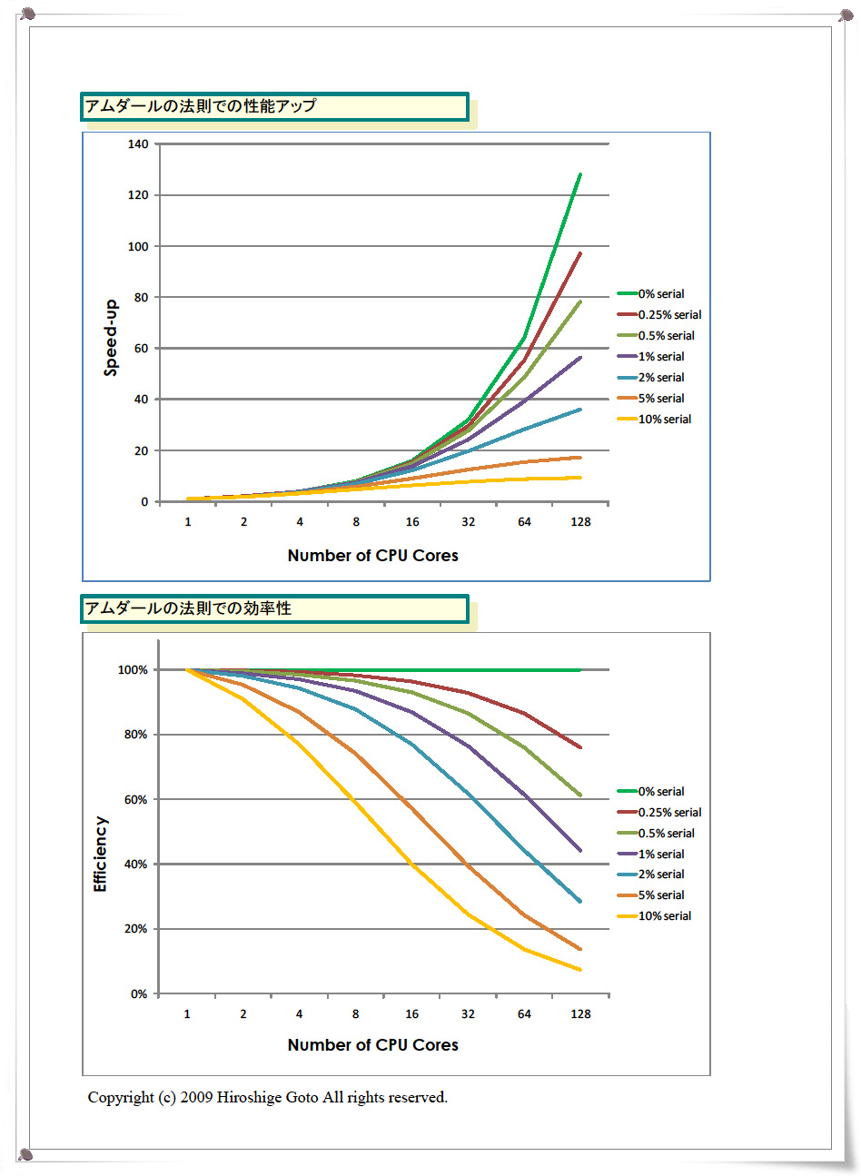 아래의 슬라이드에서 슬라이드를 축소하여 128 코어까지의 매니 코어 시대를 응시 한 그래프이다. 이것을 보면, 10%만 직렬 컴포넌트가 있으면 128 코어에서도 이론상의 성능 향상은 단 9.3 배 밖에 달성 할 수 없는 것을 알 수 있다. 이론 값이 최고 128 배가 9.3 배이므로, 피크 값의 7.3 %의 성능에 지나지 않게되어 버린다.