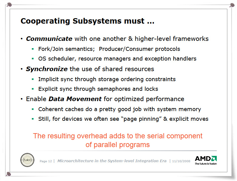 이것은 뒤집어 어찌 보면 직렬 구성 요소인 OS에서 병렬화 가능한 작업이 다른 프로세서 코어군에 오프로드 된다고 생각할 수도 있다. 또한 응용 프로그램 자체에서 처리 컴퓨팅 작업을 수행 할 수도 있다고 말한다. 아래의 슬라이드는 HPC (High Performance Computing, 슈퍼컴퓨터) 애플리케이션 중에서 데이터 병렬을 태스크 수준의 throughput 컴퓨팅으로 변환 할 수 있는 것을 꼽고있다. 또한 미래는 런타임 환경이 그러한 스케줄링을 처리 할 수 있다고도 지적되고 있다. 이 런타임에서의 처리량 컴퓨팅의 스케줄링은 Intel도 비슷한 것을 말하고 있다. 또, Intel과 AMD의 목표로 하고 있는 방향이 근본에서는 일치하는 것을 알 수있다.
