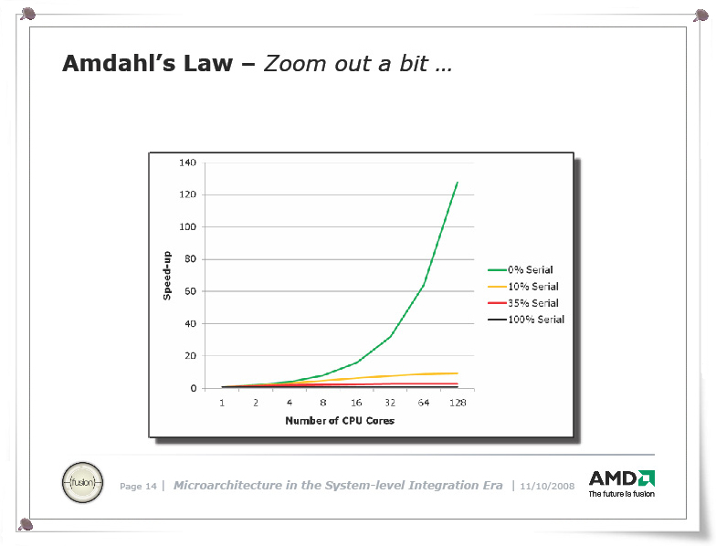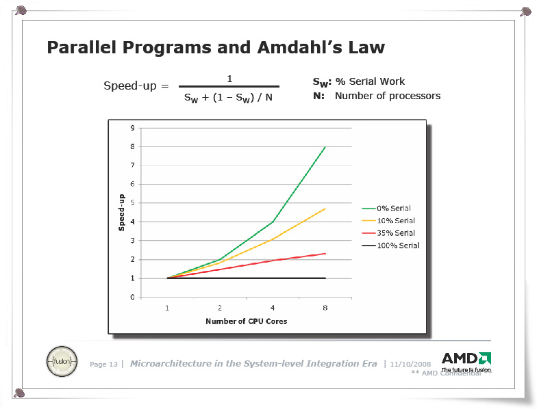 Amdahl의 법칙 자체는 잘 알려져 있지만, 그것이 얼마나 큰 제약일까는 의외로 실감되지 않는다. 아래 Amdahl의 법칙 슬라이드는 AMD의 CPU 설계자인 Chuck Moore (척 무어) 씨 (AMD Senior Fellow)가 지난해 (2008년) 11 월에 개최 된 CPU 아키텍처의 콘퍼런스 "Micro41"에서 행한 연설 프레젠테이션 것 이다. 8 코어까지의 범위에서, Amdahl의 법칙에 의한 이론적인 속도 차이를 보여주고있다. Moore 씨는 이 일련의 슬라이드에서 AMD의 2010년대의 CPU의 방향성을 부각하고 있지만, 거기서 중요한 포인트로서 다루어지고 있는 것이 Amdahl의 법칙이다.