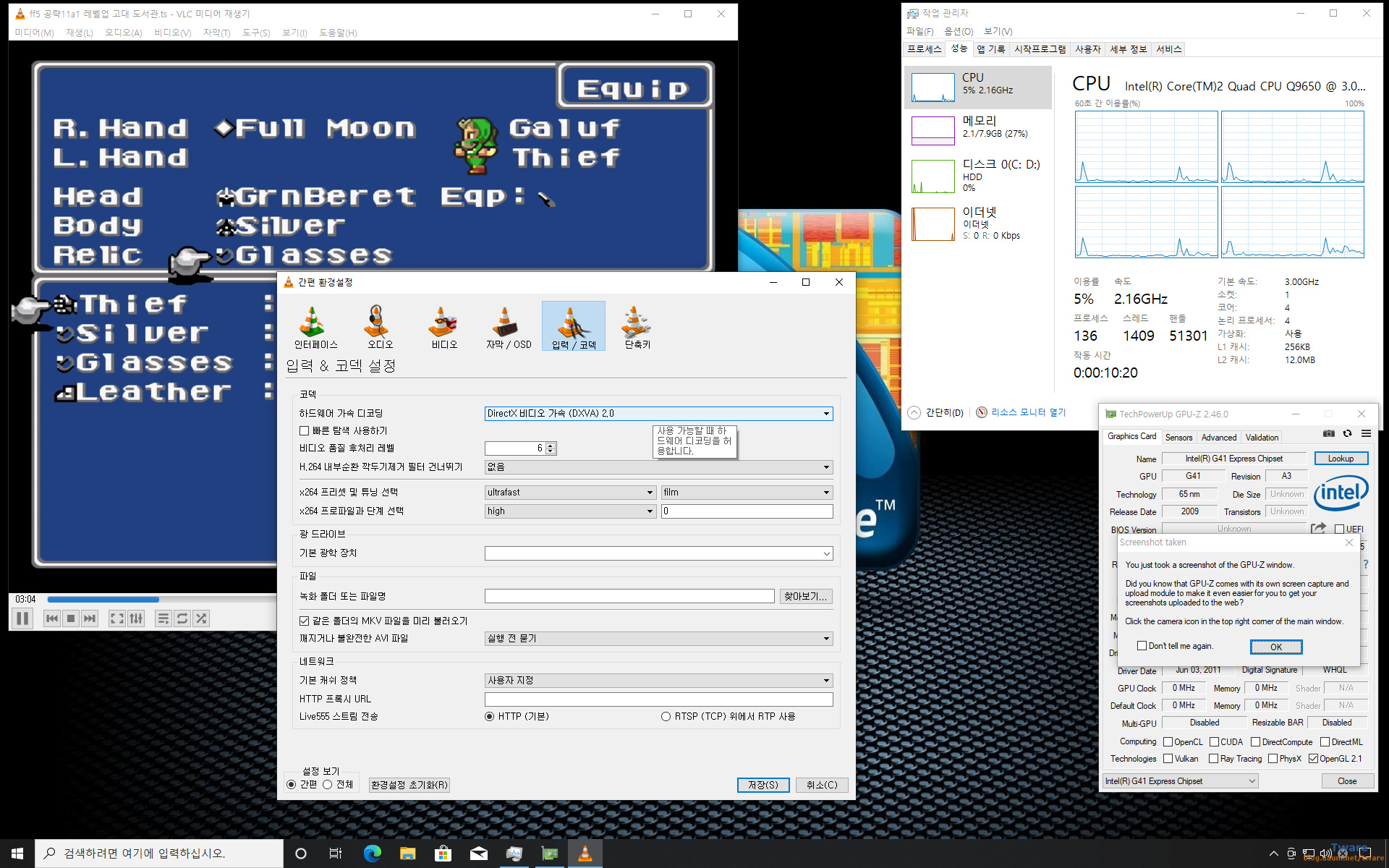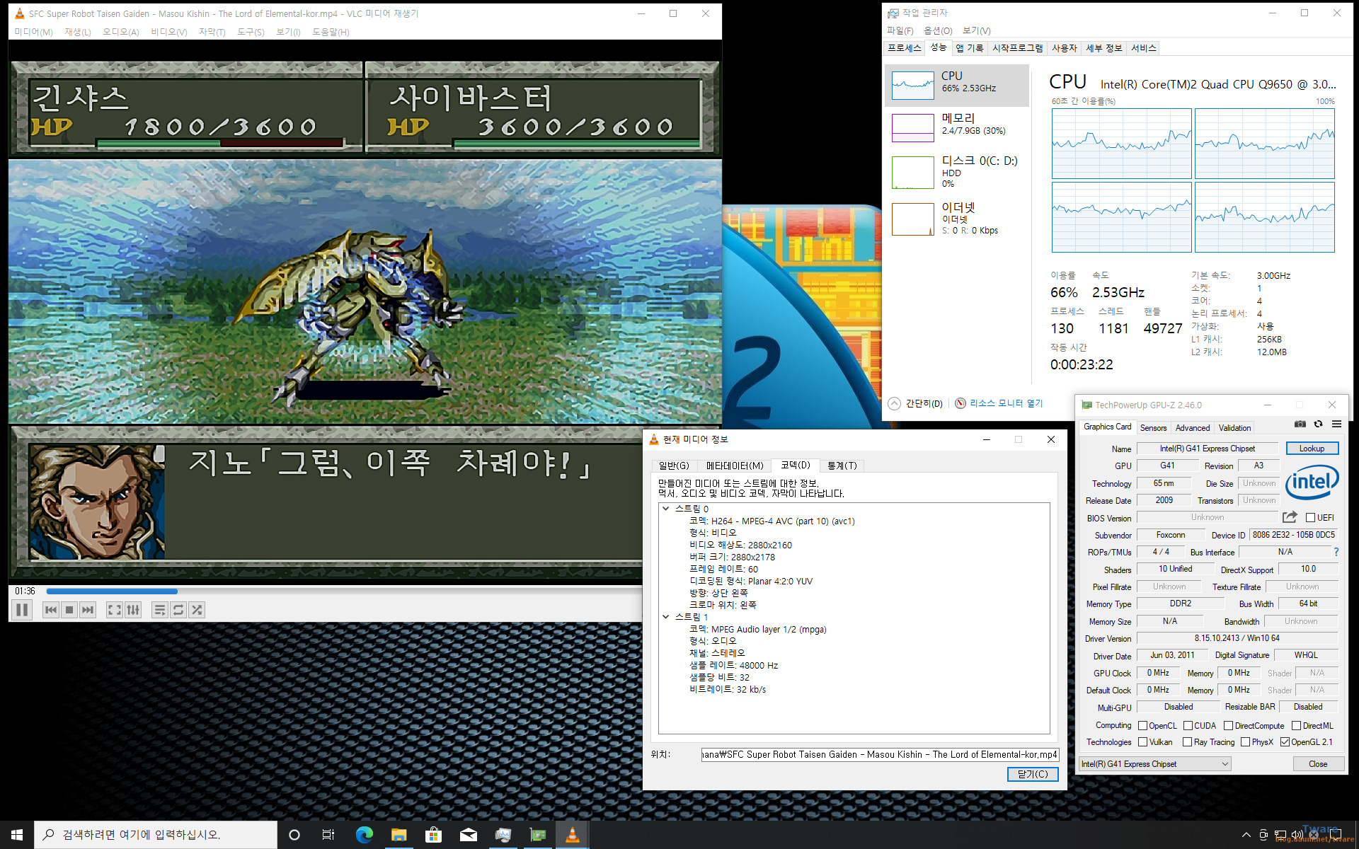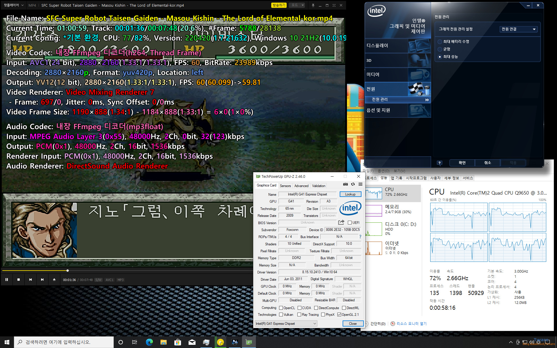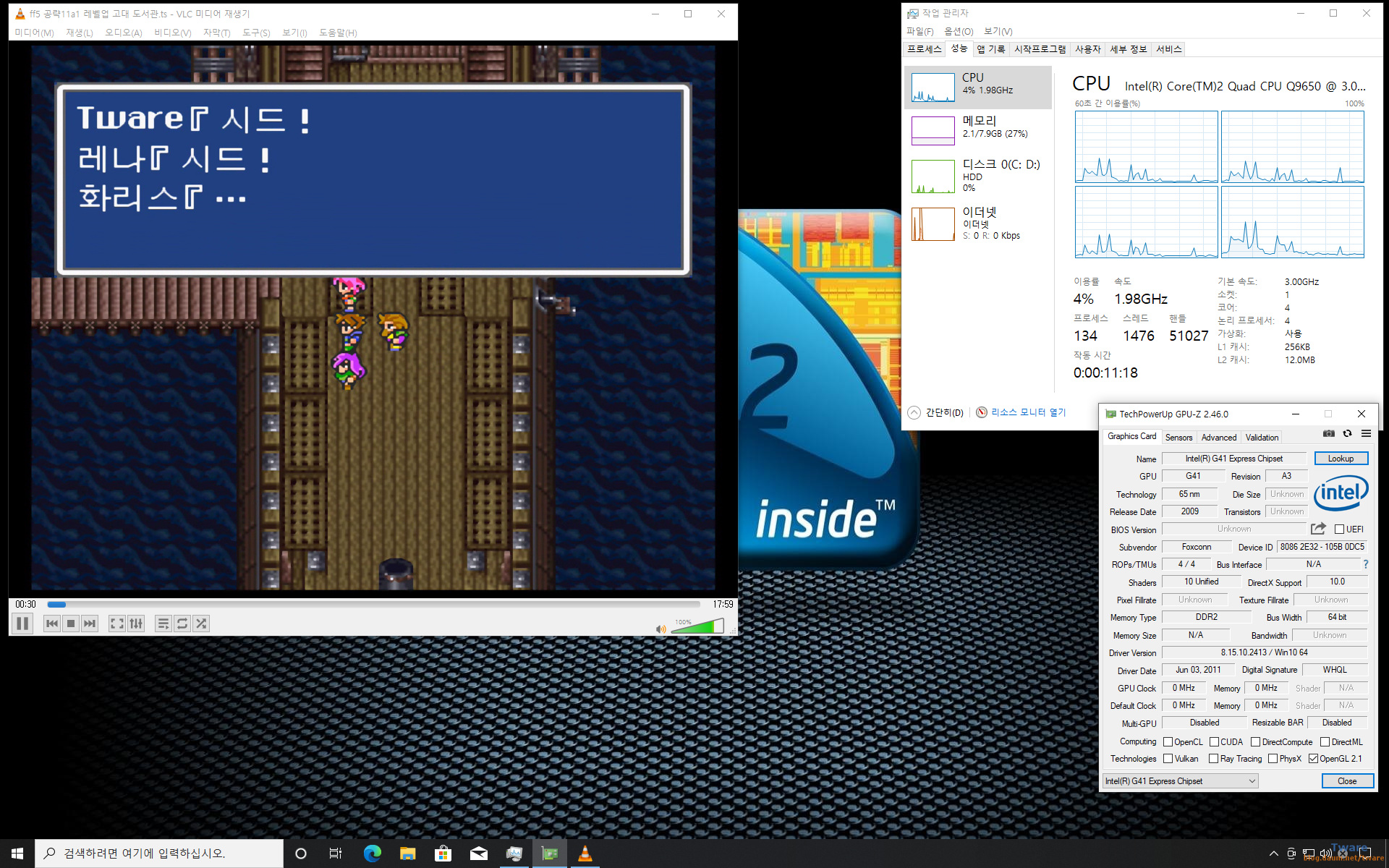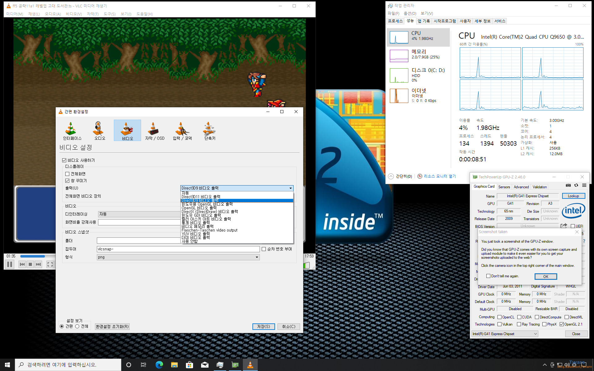 Q9650 요크필드 G41 내장 그래픽 X4500 윈도우10 드라이버 설치 2880x2160 H264 재생.