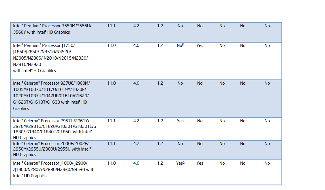 G35 (전체는 G4 시리즈. dx10 지원 그래픽들) 미만 그래픽 및 미만 세대는 DX9 지원이라도 DX9 지원 버전이 다르며, G965를 제외하고는 소프트웨어 버텍스 쉐이더 지원 입니다 (픽셀 쉐이더는 하드웨어 입니다). 865G (포함) 이하 세대는 DX9 일부 지원 입니다. 865G 이하는 DX9 게임은 그냥 안된다고 보시면 되구요. 915G, 945G, G31, G33 이런 제품들은 대충 DX9 게임이 꽤 돌아간다고 보시면 됩니다 (9.0B 가능. 9.0C 불가능. 간혹 9.0B 게임이라도 안돌아가는 게임도 존재.). 대충 라데온 9500 ~ 9800, 라데온 x300 ~ x800 과 같다고 보시면 됩니다. DX9 모든 게임이 완벽하게 다 돌아가는 것은 9.0C 지원 필요. 지포스 6000 시리즈, 라데온 x1000 시리즈 이상 지원. 인텔은 아래에서 쉐이더 모델 3 지원 이상 제품. 내장 그래픽이라 성능이 문제이긴 하지만.....