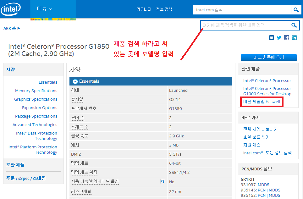모델명 검색 예 : G1850 , i3 4130, i7 4770 처럼 입력 )
