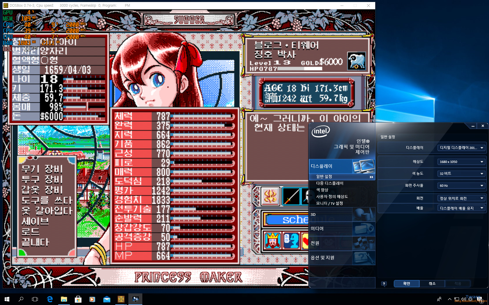 (도스박스의 OGL 옆의 프레임은 중요하게 안봐도 됩니다. 액션 슈팅 게임처럼 동적인 화면이면 프레임이 좀더 나오고, 프린세스 메이커 처럼 거의 정작인 화면은 프레임이 낮습니다. 프린세스 메이커에서 마우스를 막 움직이면 프레임이 높이 올라 갑니다.)