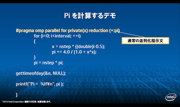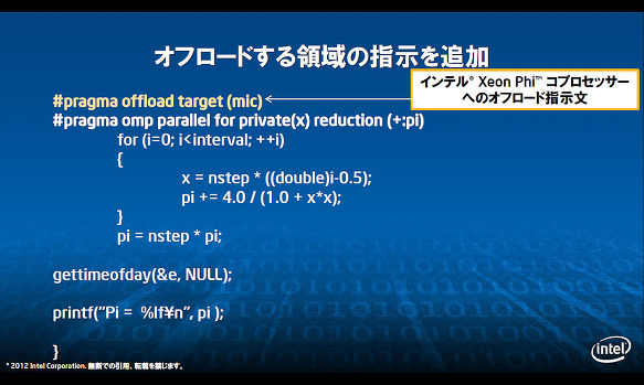 이 예제에서는 연산을 Xeon Phi로 던져 처리한다 (오프로드) 지침을 추가하고 있다. 이렇게 소스 코드의 변경은 최소한으로 끝난다 Intel은 주장하고있다 (출처 : Intel)
