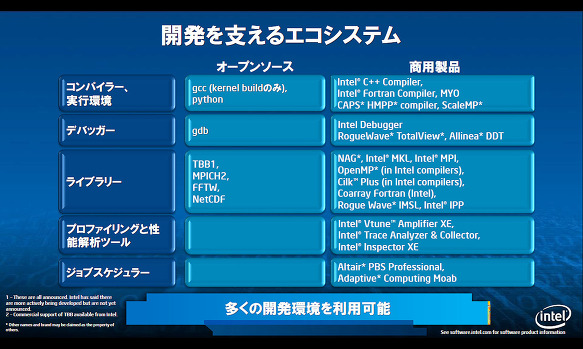 또한, Intel에 따르면 이외에도 gcc, python 같은 오픈 소스 개발 도구도 Xeon Phi에 대한 대응이 예정되어 있어 향후 점차적으로 대응 제품이 증가할 전망이라고 한다.