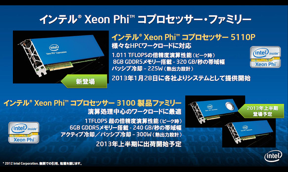 Xeon Phi에는 2 개의 SKU가 준비되어있다. 1월 28일에 5110P가 출시 된다. 3100 시리즈에 대해서는 2013년 상반기의 투입이 예정되어있다 (출처 : Intel)