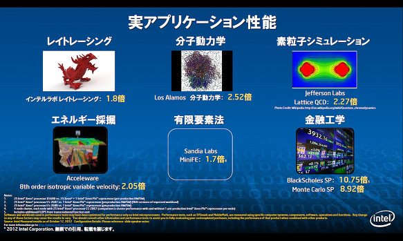 실제 애플리케이션에서 성능 향상. LosAlamos와 Acceleware 등에서 2.x 배의 성능 향상을 실현하고 있으며, 금융 공학의 응용 프로그램에서는 10 배가 넘는 성능 향상을 실현 (출처 : Intel)