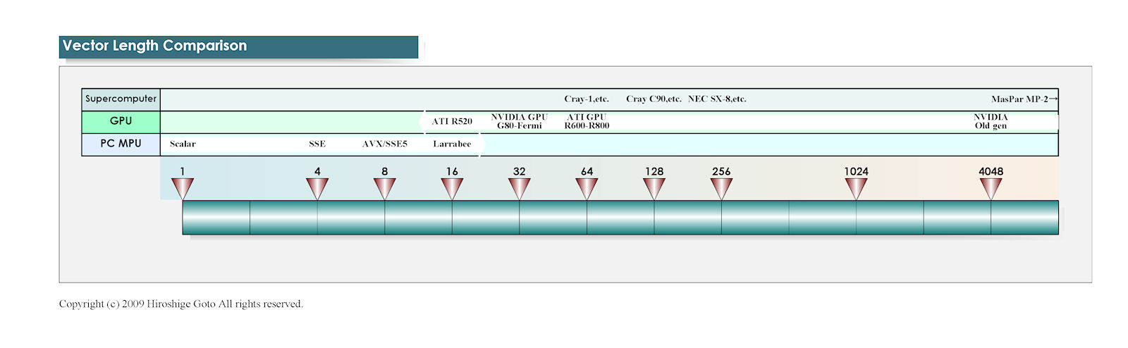 그리고 Nickolls 씨 등이 NVIDIA에서 행하고 있는 것은 앞서 언급 한대로, SIMD를 더 MIMD에 접근하는 것이다. MasPar MP-2는 구성에 따라 수천, 수만 프로세서 (최대 16000)가 SIMD로 작동했다. G80 이전의 NVIDIA GPU도 최대의 벡터 길이 (GPU의 구성에서 다른)은 4,048이었다고 AMD (ATI)는 지적하고 있다.