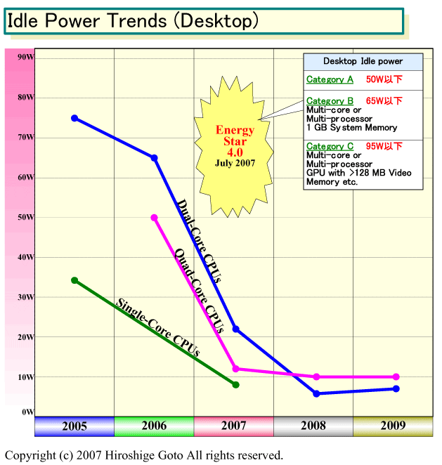 즉, Energy Star 4.0을 준수하기 위해서는 CPU 벤더는 멀티 코어 오피스 데스크톱 PC의 아이들 전력을 65W로 유지해야 한다. 전체 시스템에서 65W이므로 CPU는 대충 말해 20W 정도 또는 그 이하로 가져갈 필요가 있다고 추정된다. 따라서 데스크톱 CPU는 아이들 전력 저감이 큰 과제가 되고있다.