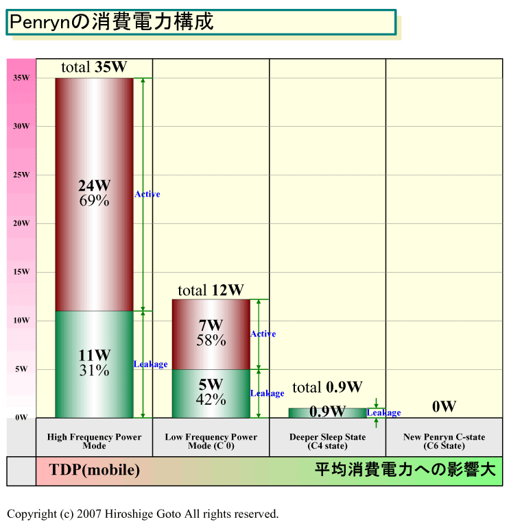 그림을 보면 알 수 있듯이 Penryn에서도 활성화시의 정적 성분도 엄청난 전력 소비되고 있다. TDP인 35W 중 31%인 11W가 누설전류에 의한다. 현재 고성능 CPU는 TDP 중 1 / 3 이상 많은 경우는 절반 정도를 누설 전류가 차지하지만, Penryn에서도 그 점은 변함 없다. 따라서 활성시의 누설 전류를 감소에 집중하면 Penryn에서 더 TDP를 낮출 여지가 있는 것으로 보인다. 그러나 Friedman 씨는 슬립때의 저소비 전력화로 더 집중할 것을 시사한다.