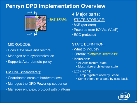 그래서 Penryn에서는 CPU에 CPU 코어의 스테이트를 대피시키는 독립 전원의 SRAM 영역을 구현. CPU 전체의 전압을 떨어 뜨려도, CPU 스테이트를 CPU에 유지할 수 있도록 했다. 알기 쉽게 비유하면, 비상등을 부여해 메인 조명을 아주 어둡게 할 수있게 된 것이다.