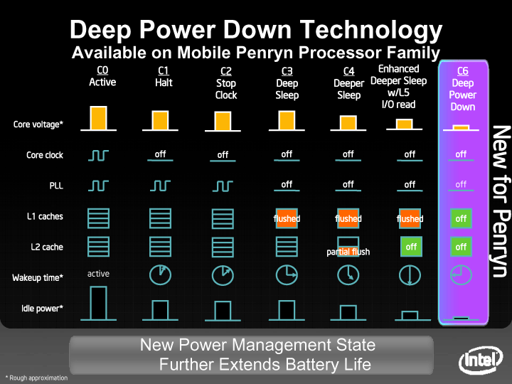 모바일에서 Penryn의 아이들시의 소비 전력이 매우 낮은 이유는 Penryn에서 구현된 "Deep Power Down C6"스테이트에 있다. C6에 따라 Penryn에서는 CPU가 대기 전력을 크게 낮출 수 있게 되었다.