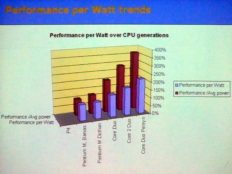 하이파 디자인 센터의 모바일 중시의 자세가 잘 보이는 것은, CPU의 평균 소비 전력의 저감의 접근에서다. 45nm 버전 Core Microarchitecture CPU "Penryn (펜린)"은 기존의 Core 2 Duo (Merom : 메롬)과 비교하면, 모바일 서비스의 아이들 전력을 단번에 내려, 그 결과 평균 소비 전력을 크게 줄일 수 있다고 한다. 모바일 CPU로서 중요해지는 기능이 더욱 강화되고 있다.