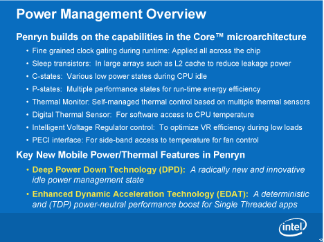 Yonah의 "Dynamic Smart Cache Sizing '와'Enhanced Deeper Sleep DC4"그리고 Penryn의 C6와 일련의 흐름을 보면, 하이파 디자인 센터가 CPU의 평균 소비 전력을 억제하는데 매우 포커스 한다. 평균 소비 전력의 저감이야 말로 동센터 CPU의 최대의 특징이라 할 수 있다.