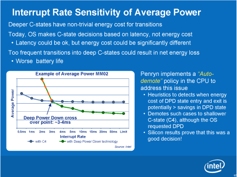 따라서 C6 스테이트에 자주 들어가는 경우에는 CPU 스테이트의 저장 및 로드 평균 소비 전력이 반대로 상승 할 가능성이 있다. Intel의 계산에서는 C6 스테이트에 3~4ms 이하의 빈도로 전환하면 평균 전력이 상승한다. 따라서 Penryn에서는 "Auto-Demote"기능을 구현한다. 자주 C6 스테이트에 들어가는 경우에는 C4 스테이트에 그치고 C6에 들어 가지 않도록 제어한다. 실제 실리콘의 시험에서는 이 기능을 사용하면 좋은 결과를 얻을 수 있었다고 한다.