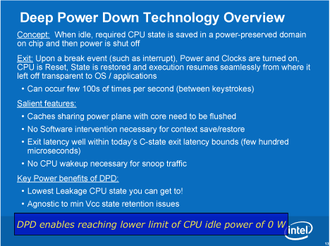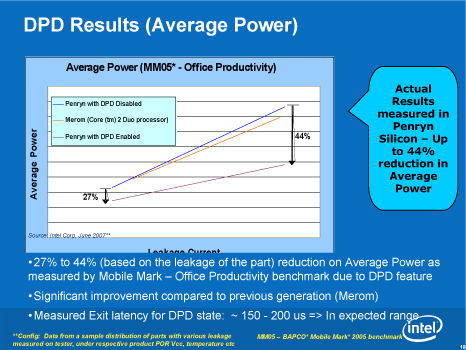 Penryn의 전력 절약 제어의 포인트는 여기에 있다. CPU 코어를 리텐션 수준 이하로 낮출 경우 만약 CPU 스테이트를 CPU 외부 메모리에 저장하면 웨이크업시 스테이트를 CPU로 돌려 보내려면 엄청난 시간이 걸린다 (오래 걸린다고 해도 단위는 매우 작은 단위 입니다. 몇초 몇십초가 아닌). 이것은 절전 모드로 실용적이지 않다. "CPU 절전 전력을 줄이기 위해 해야 할 일은 누설 전류를 줄이면서 빠른 응답 시간을 얻을 수 있도록 할 것"이라고 Friedman 씨는 설명한다.