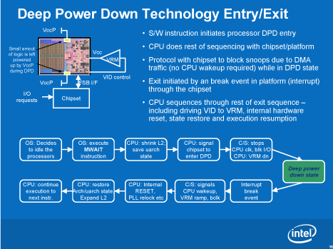 (3) 모든 CPU 코어가 "CC4"스테이트에 들어가면 CPU 패키지 "C4 (Deeper Sleep)"로 들어가서 CPU 전체 공급 전압이 캐시의 데이터 내용을 유지 가능한 한계 레벨 (Cache retention)로 내려간다. 현재는 CPU 코어 단위로 다른 전압을 제공 할 수 없기 때문에 CPU 패키지 전체에서 전압을 일정하게 제어한다. (코어별로 다른 전압을 제공하는 것은 하스웰 부터)