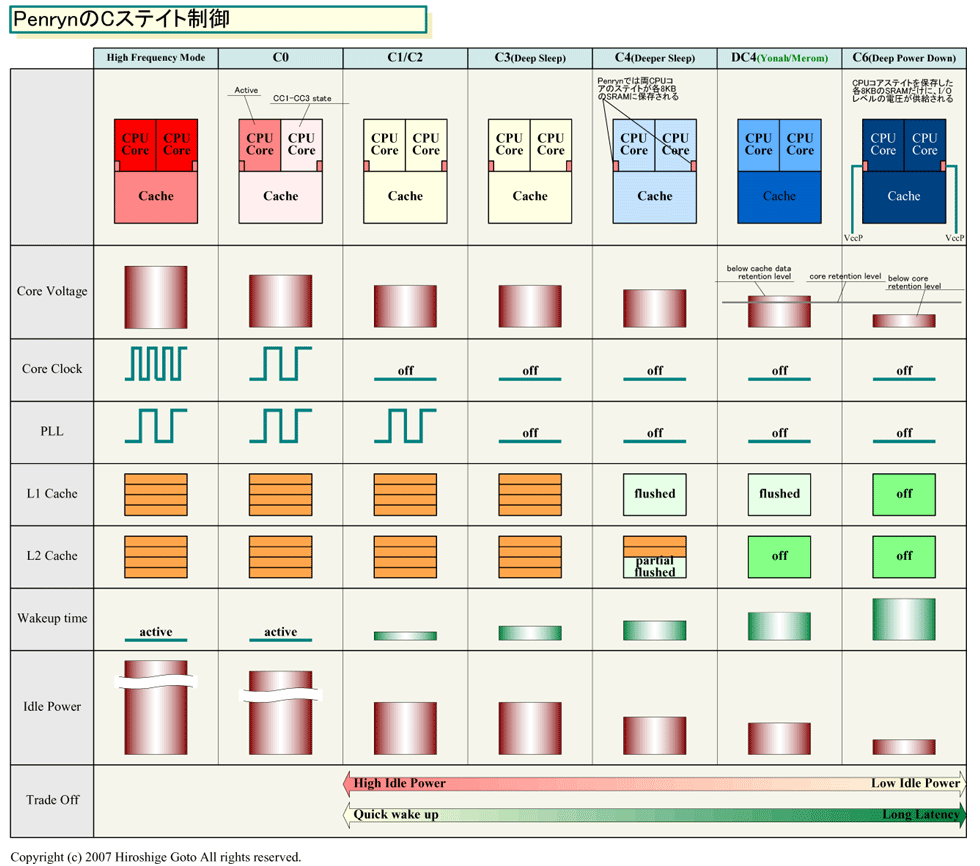 이렇게 보면 Penryn의 C6은 CPU 스테이트를 레이턴시의 전용 스토리지에 저장해 버리면 CPU 전체를 파워 다운 할수 있는 콜럼버스의 달걀같은 트릭으로 실현된다. 아이돌 전력 절감을 위해, C 스테이트를 아래로 아래로 파간 하이파 디자인 센터 시도의 최종 도달점이다.