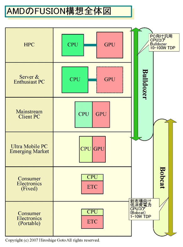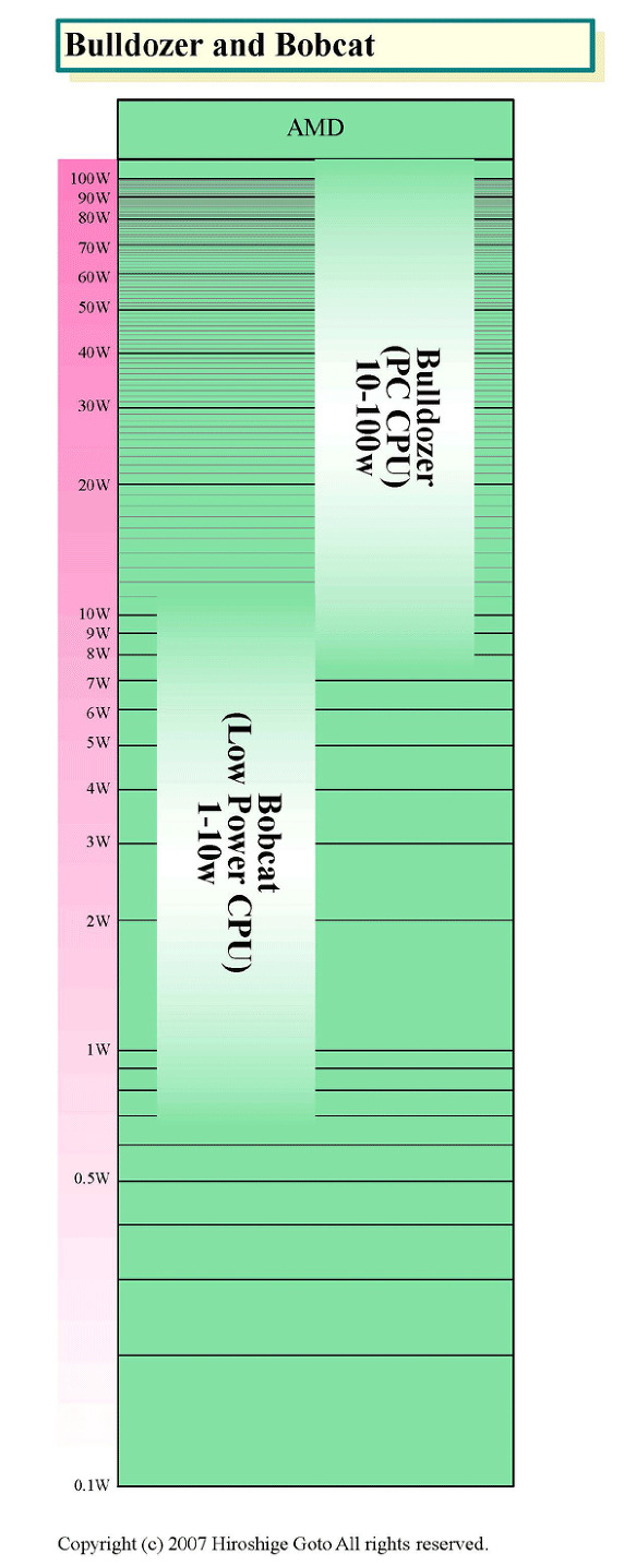 PC & 서버 전용 코어가 "Bulldozer (불도저)"코어, 가전 및 휴대 기기 시장을 주요 타겟으로 하는 코어 "Bobcat (밥캣)." 각각 다른 TDP (Thermal Design Power : 열 설계 전력)로 성능 범위에 최적화된 마이크로 아키텍처다. 구체적으로는 Bulldozer 코어가 10 ~ 100W의 TDP 범위, Bobcat 코어가 1 ~ 10W의 TDP 범위에 대응한다..