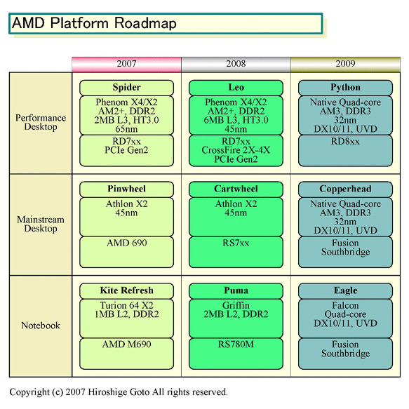 클라이언트 플랫폼은 1년 마다 이행한다. 퍼포먼스 데스크탑은 2007 년 "Spider (스파이더)"에서 2008년 "Leo (레오)"를 거쳐 2009년에는 'Python (파이썬) "으로, 메인 스트림 데스크톱은 2007년 "Pinwheel (핀휠)"에서 2008년 "Cartwheel (카트휠) '을 거쳐 2009년에는'Copperhead (코퍼헤드)"로 이행한다. 모두 2009년 플랫폼은 소켓 AM3, GPU 코어는 DirectX 11 세대, 메모리는 DDR3, HyperTransport 3.0이 되며, CPU는 32nm 공정으로 전환하는 로드맵이다. 또한 2009년에는 메인 스트림 데스크탑에도 쿼드 코어를 침투시킨다.
