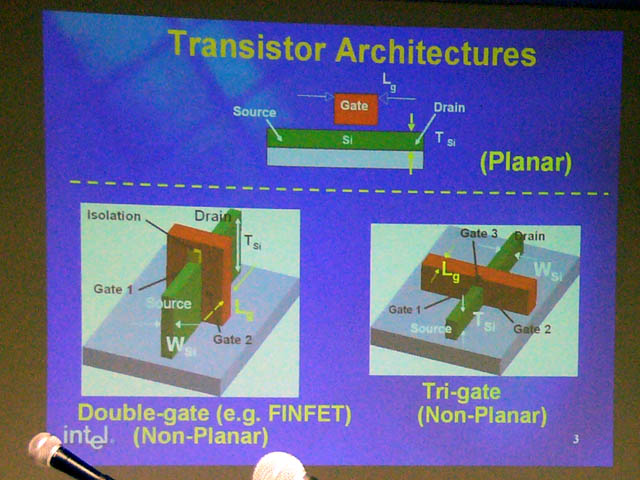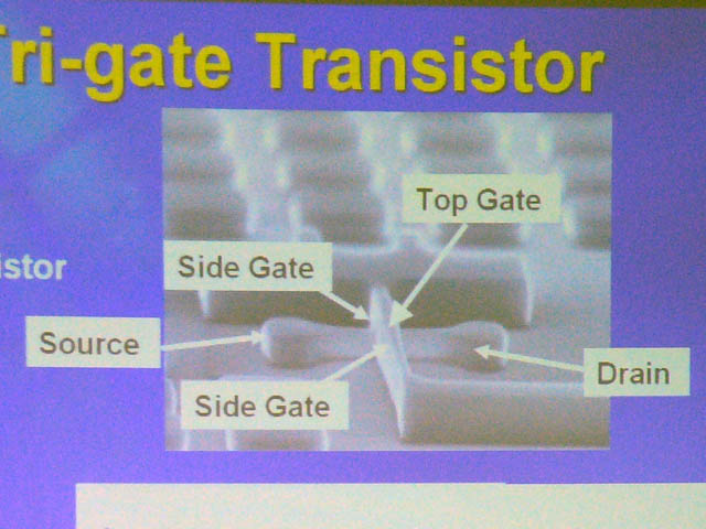 미국 Intel 은 12일 교토에서 개최 된 "2003 Symposia of VLSI Technology and Circuits"에서 게이트 길이 30nm의 "트라이 게이트 트랜지스터 '가 연구 단계에서 개발 단계에 들어간 것을 발표했다.