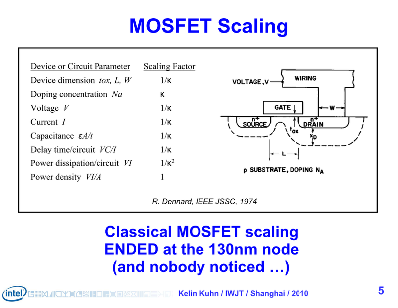 그러나 점차적으로 구동 전압이 스케일 다운되지 않게 되고 전력이 감소되지 않게 되어 동작 주파수의 성장도 완만하게 되었다. 전력과의 싸움이 시작되었다. 그래도 트랜지스터당 비용은 떨어짐이 계속되어 반도체 업체들은 무어의 법칙의 장점을 누릴 수 있었다. 공정 세대마다 칩의 트랜지스터 수를 배로 늘리고,이를 통해 연산 유닛을 늘려 아키텍처를 확장하고 기능을 통합 하였다. 그러나 이것은 세대마다 트랜지스터 비용이 떨어질 것이라는 전제가 있었기 때문이었다.