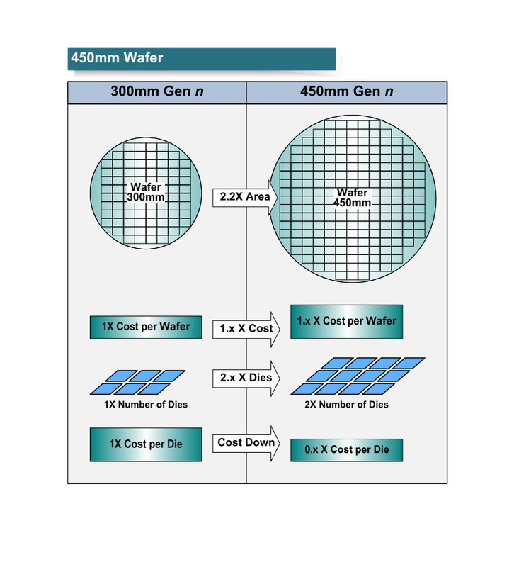 지금까지 반도체 산업은 실리콘 웨이퍼를 대구경화 하는 것으로, 코스트 다운을 측정해 왔다. 이번에도 그것을 다시 반복하자 라는 움직임이 활발해지고 있다. 현재 주류 웨이퍼 직경 300mm를 450mm로 1.5 배하면 1 매의 웨이퍼에서 제조 할 수 있는 칩의 수와 트랜지스터 수가 최대 약 2.2 배로 늘어난다. 그러나 웨이퍼당 비용은 숙련되어 가면 2배로 늘뿐 (보통) 1.x 배로 된다. 따라서 칩당 또는 트랜지스터당 비용은 웨이퍼의 대형화로 감소하게 된다. 이것이 웨이퍼의 대구경화의 논리다.