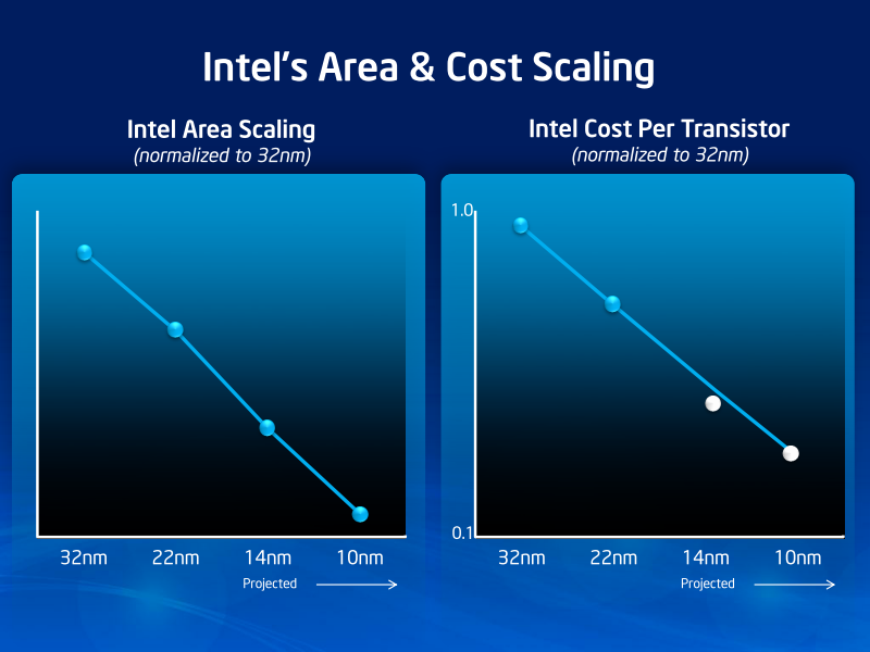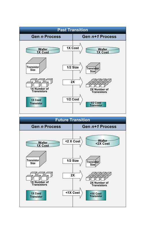 지난 몇 세대에 걸쳐 웨이퍼 자체의 비용이 상승 웨이퍼당 공정도 복잡한 만큼 (예를 들어 노출이 다중 된) 비용이 상승했다. 그래도 CMOS 스케일링의 효과는 웨이퍼당 비용 상승을 계속 웃돌아, 트랜지스터당 비용은 추락했다. 55nm보다 40nm 쪽이 트랜지스터 비용은 낮고, 40nm보다 28nm 쪽이 더 떨어졌다. 따라서 CPU와 GPU, SoC 제조 업체는 공정의 미세화 때 마다 같은 수준의 다이 사이즈로 동 가격대의 칩 아키텍처와 성능을 확장했다. 예를 들어, GPU 아키텍처는 28nm에서 NVIDIA는 Kepler (케플러)를 AMD는 GCN (Graphics Core Next)을 실현했다.