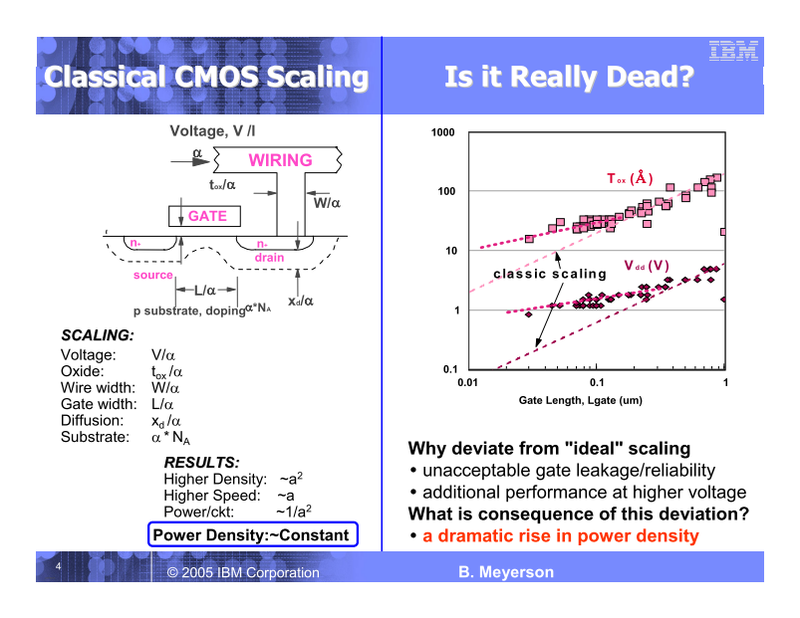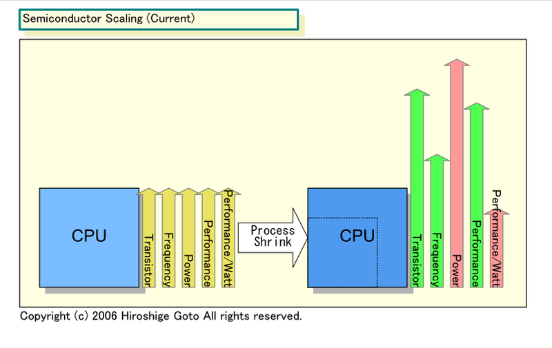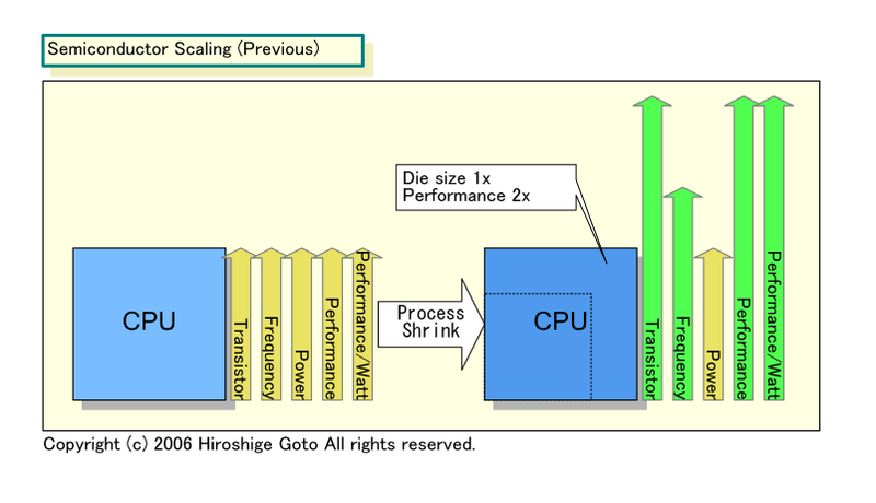 옛 고전 CMOS 스케일링의 시대에는 모든 것이 괜찮았는데. 프로세스 노드가 1세대 (0.7 배 = 가로 세로 0.7로 줄어들면 면적은 0.5배가 되죠.) 미세화 되면 트랜지스터의 크기는 절반의 0.5 배가 되어, 같은 크기의 다이 (반도체 본체)에 2배의 트랜지스터를 올릴 수 있었다. 그렇게 하면, 웨이퍼의 공정 비용은 거의 변함없이, 트랜지스터당 비용이 절반 0.5 배가 되었다. 칩에 싣는 트랜지스터를 세대마다 배가 되어도 칩당 비용은 거의 일정했다. 또한, 구동 전압은 0.7 배, 소비 전력은 0.5 배, 동작 주파수는 1.4 배가 되었다.