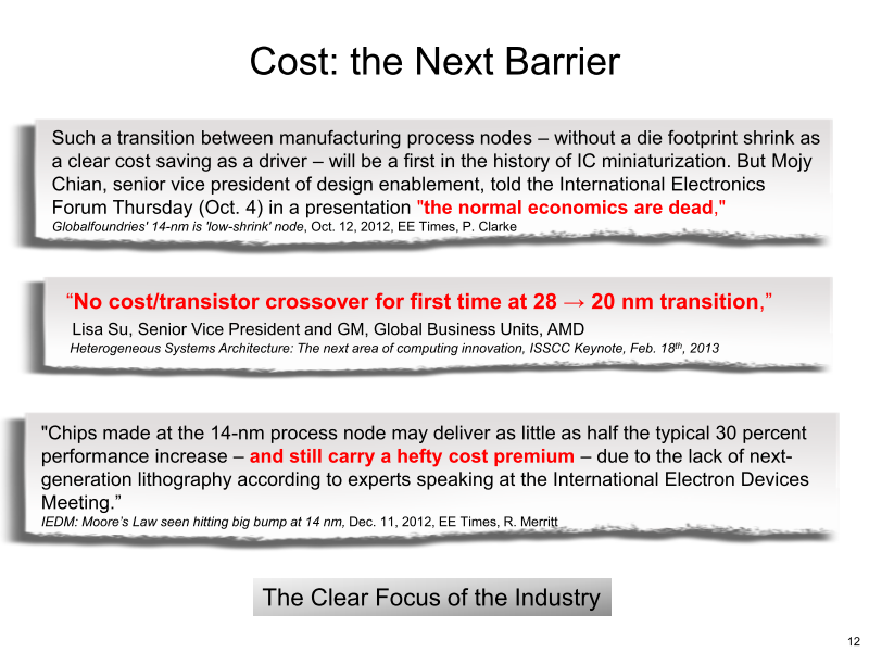 이 문제가 크게 받아들여지기 시작한 것은 2년 정도 전으로, 아울러 다양한 움직임이 반도체 업계에서 일어나고 있다. 하나는 450mm 웨이퍼로의 전환으로 웨이퍼의 대구경화에 의한 트랜지스터당 비용 절감, 미세화에 의한 비용 절감의 한계를 완화하려고하고 있다. 450mm 로의 이행이 한때 급 가속된 원인의 하나는 이 트랜지스터 비용 절감의 한계에 있다. "450mm 아자아자 " Intel에 끌려가는 형태로, 업계는 450mm로 움직이고 있다.