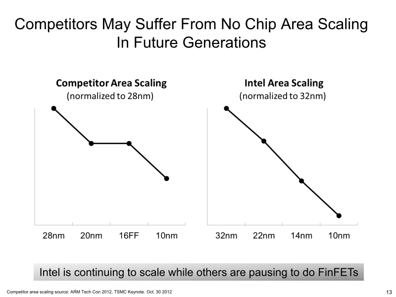 20nm에서 16/14nm로의 전환은 백엔드는 공통이므로, 원리적으로 트랜지스터는 스케일 다운하지 않는다. 뿐만 아니라, 멀티 채널에서는 트랜지스터 크기가 커질 수도 있다. 따라서 공정이 이주되도 트랜지스터 밀도는 원칙적으로 다르지 않다. 또한 FinFET 화로 웨이퍼당 비용이 증가하는 것으로 알려져 있으며, 트랜지스터당 비용은 더욱 올라 버린다. Intel은 지난 5월 Jefferies TMT Conference 프리젠테이션에서 이 문제를 아래의 슬라이드에서 지적하고 있다.