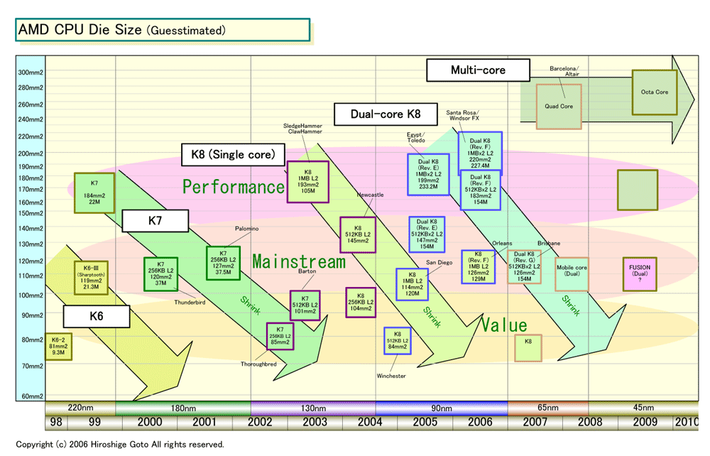 AMD의 CPU 제품의 다이 크기는 하이 엔드 데스크탑 CPU에서 200 제곱 mm 정도, 메인 스트림 CPU에서 120 ~ 150 제곱 mm, 저가 CPU에서 100 제곱 mm 전후 또는 그 이하. 따라서 FUSION 절반의 다이 (반도체 본체)를 GPU 코어에 할애해도 탑재 할 수있는 GPU 코어의 규모는 어느 정도 제한된다. GPU의 다이는 하이 엔드 GPU가 300 제곱 mm 이상, 미드 레인지 GPU에서 120 ~ 150 제곱 mm, 저가 GPU로 100 제곱 mm 전후 또는 그 이하. 따라서 45nm 프로세스 세대의 FUSION에 통합 GPU 코어는 65nm 세대 1 랭크 아래의 개별 GPU 정도의 규모다.