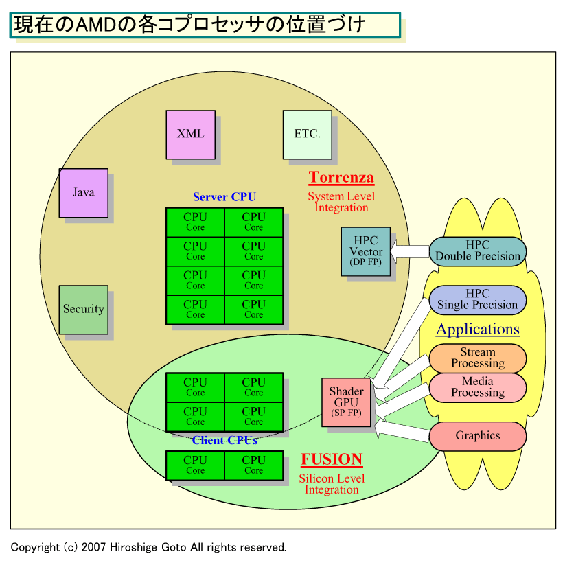 (FUSION 의해) 매우 효율적이고 최적화되어 이전보다 뛰어난 그래픽 기능을 가진 기반 플랫폼이다. Torrenza 형 시스템은 거기에 플러스하여 보다 높은 수준의 기능 통합이 가능하게 된다. 즉, (CPU의) 실리콘에 (코 프로세서를) 통합함으로써 시장 기능을 널리 보급시킨다. 또한 그런 Torrenza 계열의 가속기에서 고급 기능을 추가 할 수 있다. 실리콘에 모두 통합하는 것이 아니라 Torrenza로 제공하는 것도 병존한다. Torrenza 형 가속기는 적어도 우리가 예상 할 수있는 만큼 향후 계속 병존하고 남는다고 생각하고있다 "