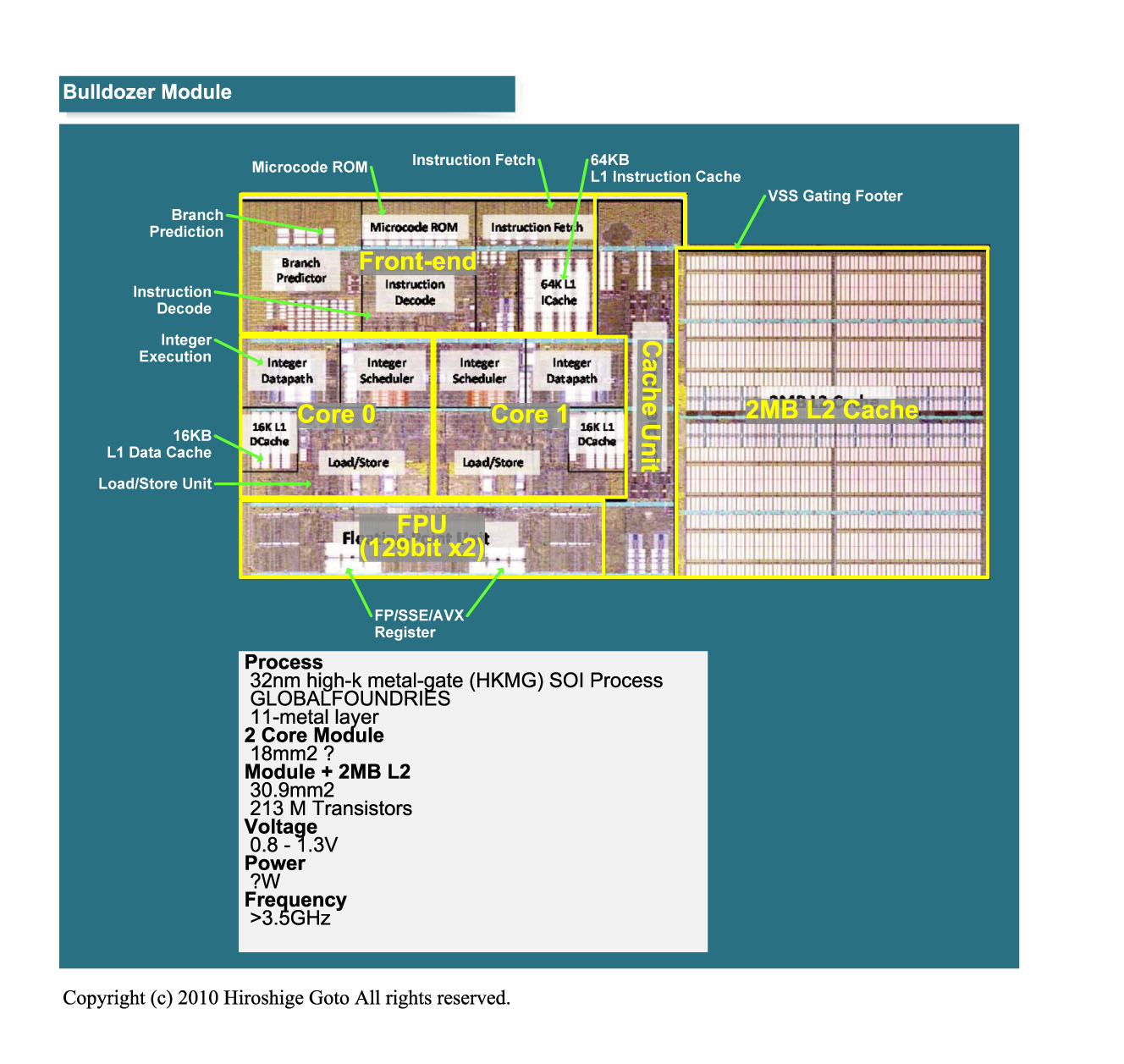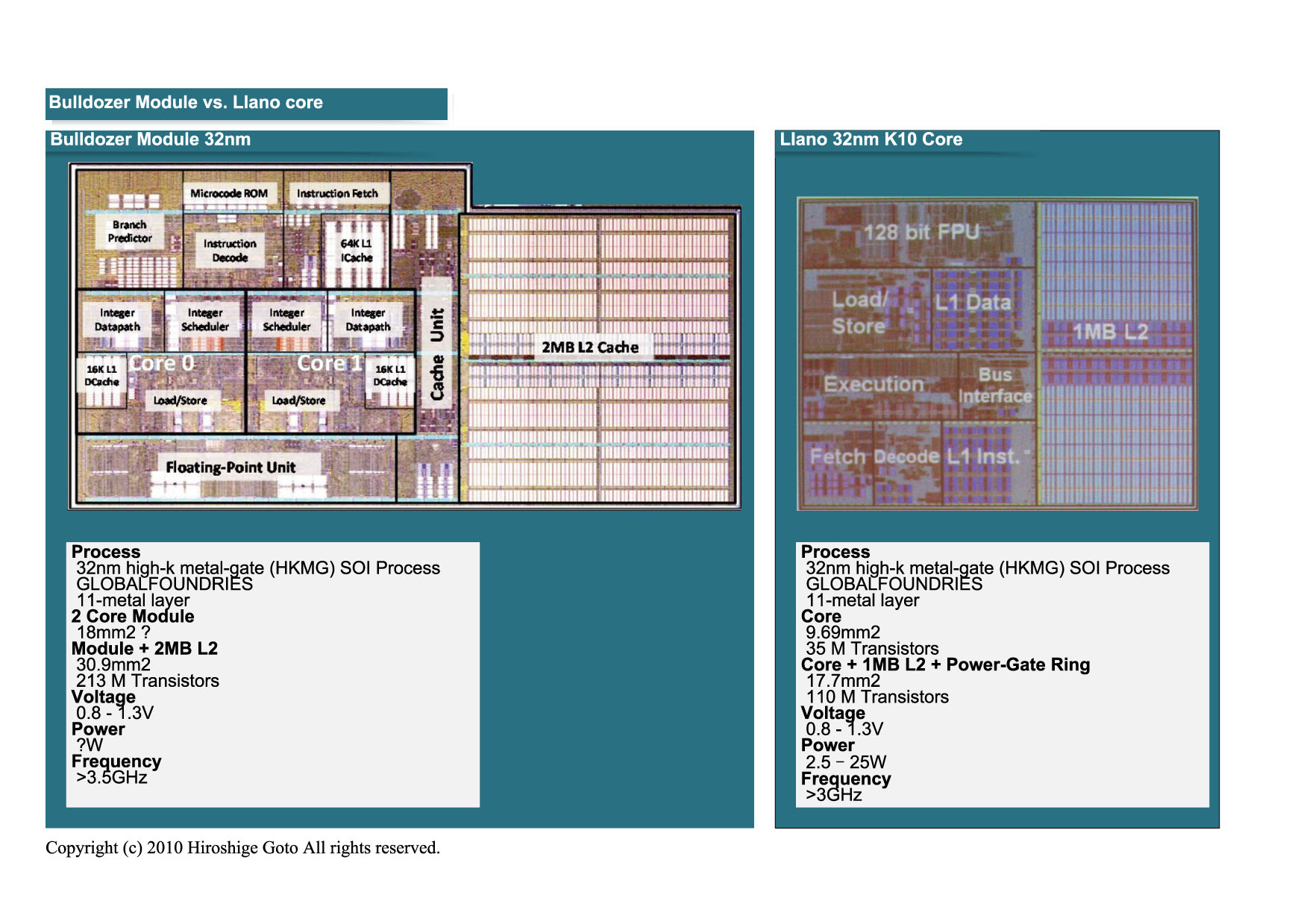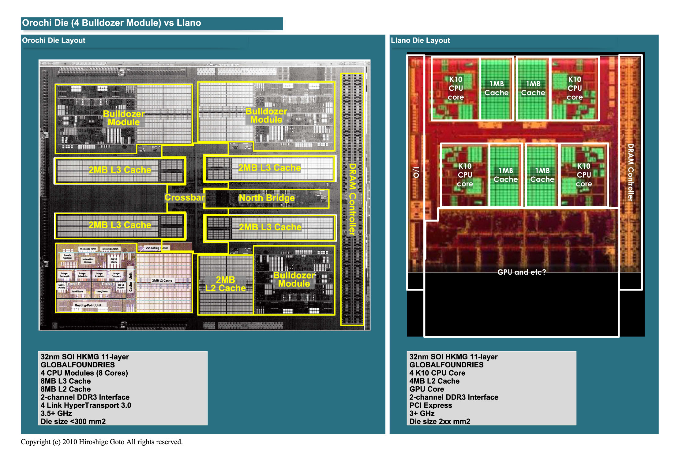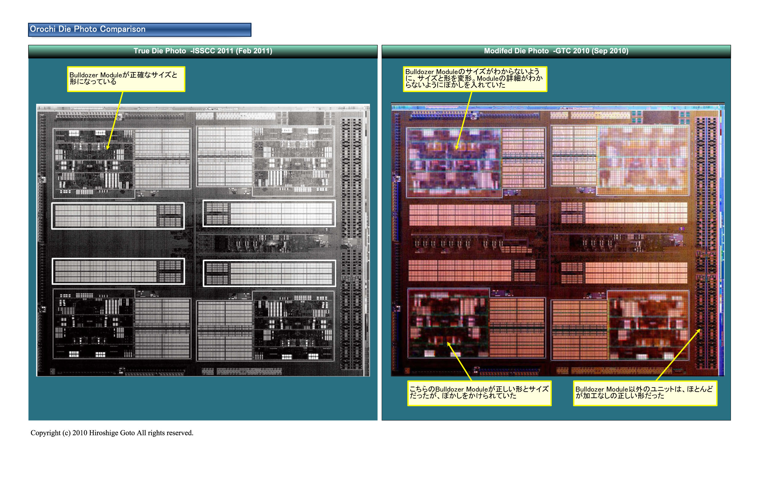 AMD는 실은 작년 (2010 년) 9 월에도 Orochi 다이 사진을 공개했다. 그러나 이때의 다이 사진은 가공이 더해져 CPU 코어의 개요 및 크기를 알 수 없도록 되어 있었다. 아래 그림의 오른쪽의 사진이 작년 것이다. Bulldozer Module 부분이 가공되고 있는걸 알 수 있다. AMD가 명백한 가공을 해가며 숨기고 싶었던 것은, Bulldozer Module의 크기와 모양이다. 이번 ISSCC에서는 그것이 밝혀졌다.