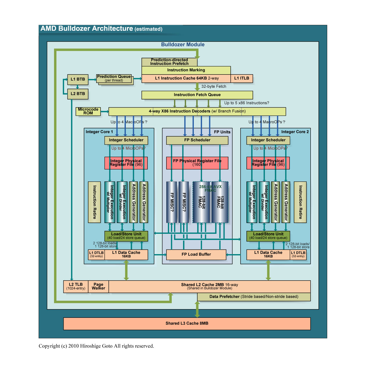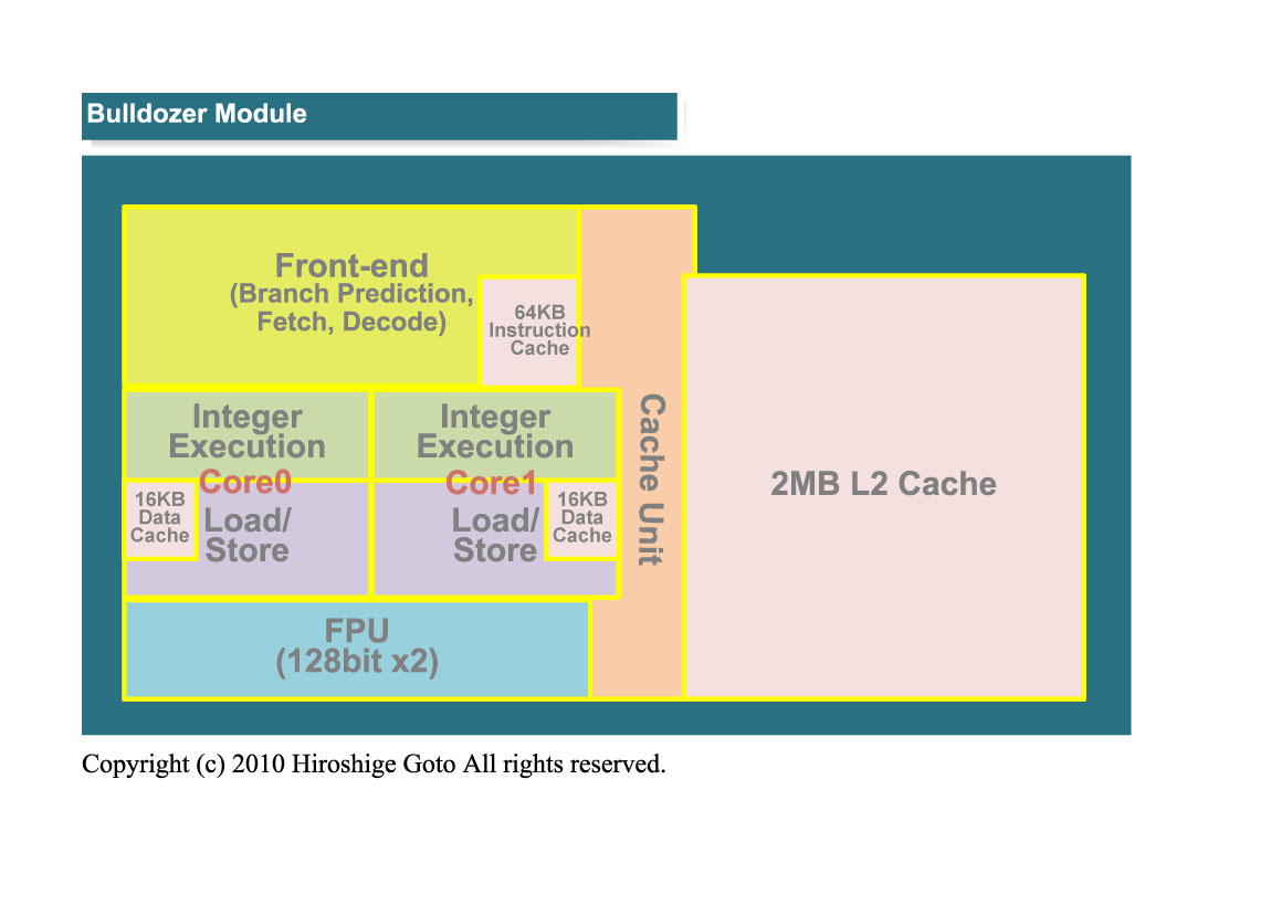 Orochi에 4 개 탑재되어 있는 Bulldozer Module은 각각 아래의 그림과 같은 구조로 되어 있다. CPU 모듈 부분은 큰 유닛마다 명확히 구분되어 있으며, 유닛군 사이에는 클럭 드라이버의 띠가 이미 끼워져 담겨 있다. 맨 위의 유닛군이 프런트 엔드의 명령어 인출 / 해독 및 분기 예측, 64KB의 L1 명령어 캐시. 그 아래에 정수 코어가 2 개 나란히 있다. 정수 코어는 정수 연산 파이프 블록과 로드 / 스토어 계의 블록 상하로 나누어져 있다. 로드 / 스토어 유닛은 16KB의 L1 데이터 캐시가 코어에 각각 포함되어 있다. 아래는 부동 소수점 (FP) 유닛이다.