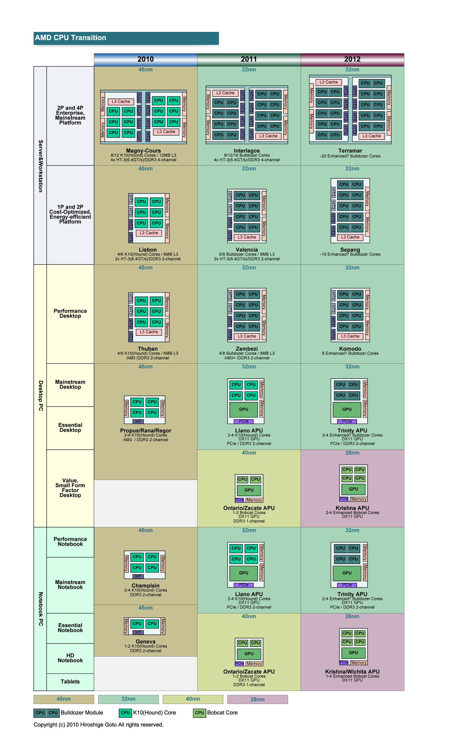 Orochi 다이는 AMD가 올해 중반에 서버 및 하이 엔드 데스크탑에 투입하는 CPU 제품군의 기반이 된다. 제품으로 코드 네임은 하이 엔드 데스크탑이 "Zambezi (잠베지)"서버 "Valencia (발렌시아)"와 "Interlagos (인터라고스) '다. Interlagos는 2 개의 다이를 패키지에 연결한 MCM (Multi-Chip Module) 16 코어 (8 모듈)이다.