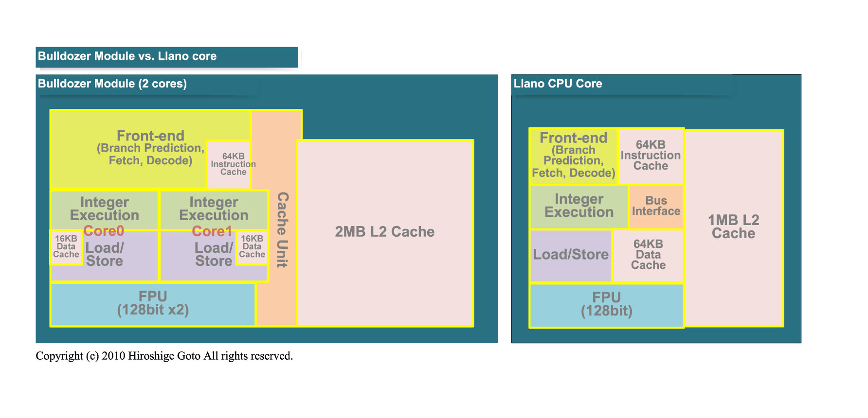 Llano의 32nm K10 코어의 크기는 CPU 코어 뿐이라면 9.69 제곱 mm. CPU 코어 + 1 MB L2 캐시 + 파워 게이팅 링에서 17.7 제곱 mm가 된다. 비교되는 Bulldozer Module은 2 코어분 모듈과 2MB L2캐쉬가 30.9 제곱 mm. 다이 사진을 보면 2MB의 L2를 제외한 부분은 18 제곱 mm 정도로 보인다. 즉, 2 코어분 Bulldozer Module 본체는 1 코어 분의 K10 CPU 코어의 약 2 배의 면적 셈이다.